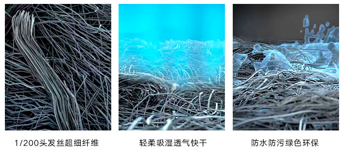 它采用了双组份超细旦纤维技术,1/200头发丝的超细纤维通过高压水针穿刺技术缠绕成型。