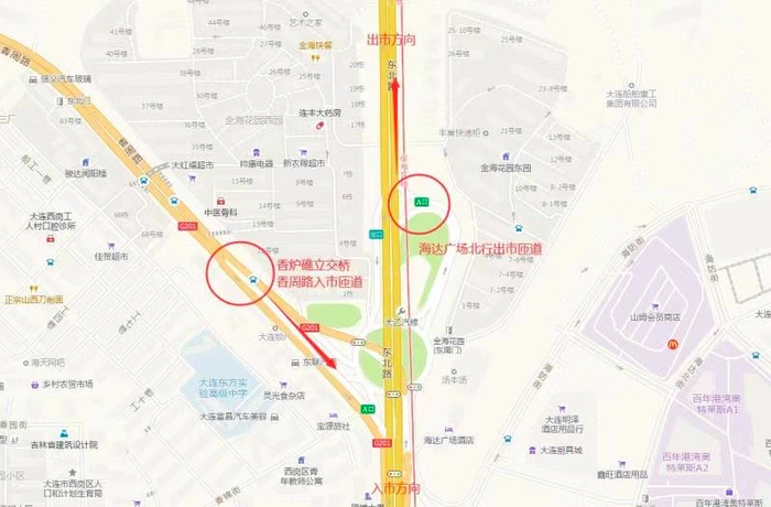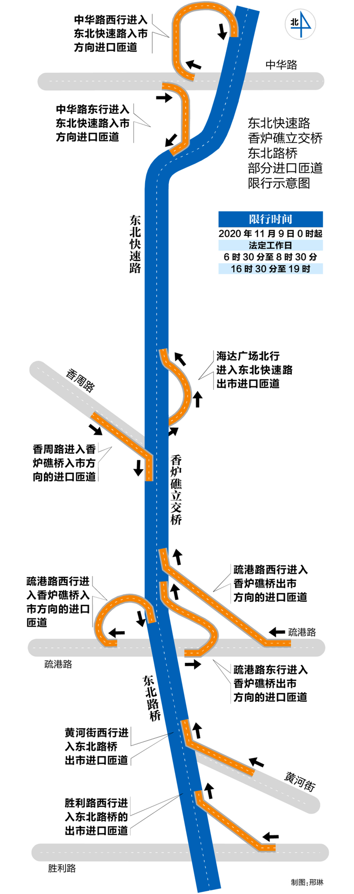 (一)具体限制通行匝道名称为:东北快速路的中华路入市南、北2个匝道、海达广场北行出市匝道;香炉礁立交桥的香周路入市匝道、疏港路西行出市和入市匝道、疏港路东行出市(东快路)匝道、黄河街出市匝道;东北路桥的胜利路出市匝道。