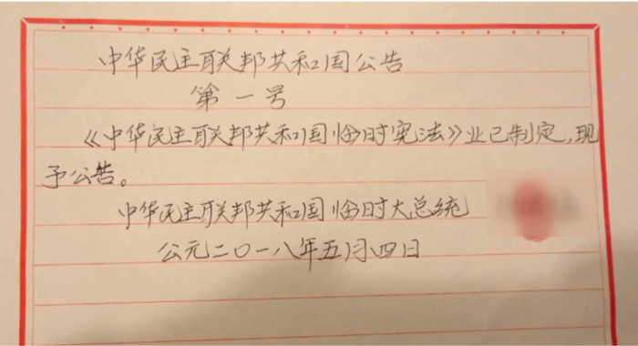“我正式成为大总统。”在境外一家酒店房间里,河南一省直机关工作人员张某举起右拳,宣誓自己出任“大总统”。他还起草了“建国纲领”和“建党纲领”,宣布成立“中国民主共和党”和“中华民主联邦共和国”,并宣誓出任“大总统”,颁布“总统一号令”。