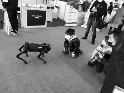 “来,到我这里来,快点,快点。起来,蹲下。”5岁的小朋友刘欣,在一旁与机器狗A1玩了起来。在工作人员的指挥下,机器狗A1蹦跳着走到小朋友跟前,又调皮地后退几步,顺势还做了几个侧滚翻和后空翻。
