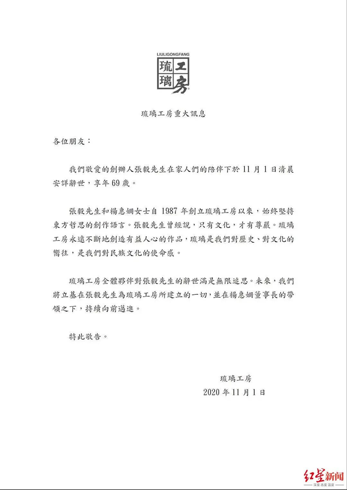 11月1日,红星新闻记者从琉璃工房处证实张毅去世的消息,“我们敬爱的创办人张毅先生在家人们的陪伴下于11月1日清晨安详辞世,享年69岁。”