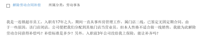 我是一连锁超市员工,入职有17年之久,期间一直从事库房管理工作,属门店二线,已签定无固定期合同。由于一些原因,该门店闭店,公司便把我们分配到其他门店当营业员,但本人性格不适合做一线销售,我能为此解除劳动合同获得补偿吗?补偿标准是多少?另外,入职前3年公司没给我上保险,能让补齐吗?