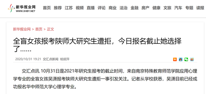 10月31日是2021年研究生报考的截止时间,来自南京特殊教育师范学院应用心理学专业的全盲女孩吴潇报考陕师大研究生遭拒一事引发关注。