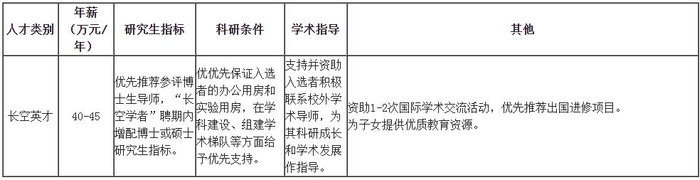 “长空英才”:已在相关学术领域崭露头角,且具有较大学术发展潜力的优秀中青年人才,以入选国家级高端人才计划为培养目标。