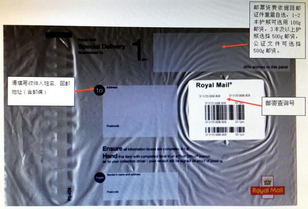 (一)寄往总领馆的信封要求:因证件涉及个人重要信息,防止丢失或误投,请务必选用英国皇家邮政(Royal Mail)Special Delivery邮寄服务。