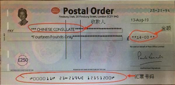 (三)准备邮局汇票:请在邮局购买金额为14英镑/每本的邮局汇票(Postal Order),收款人处写:CHINESE CONSULATE。注意:总领馆提供邮寄服务不收取任何服务费。您购买的邮局汇票是证件办理费用。总领馆不接受现金,如发现邮件中夹带现金,此次预约作废,做退件处理。