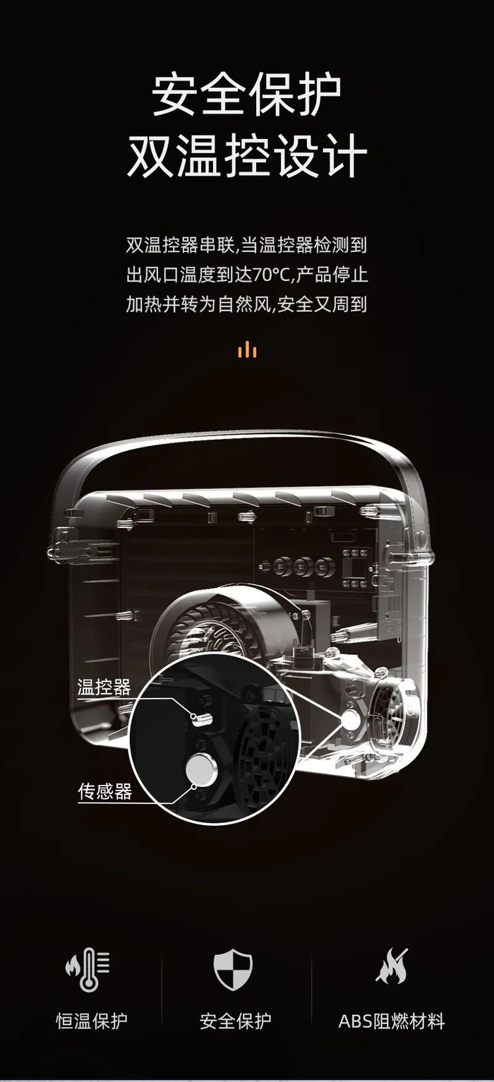 而斗禾取暖器的双温控设计就很让人安心了。温度传感器检测温度,如果温度传感器失灵,温控器也能检测温度是否过高,从而避免事故发生,相当于上了双层保险~