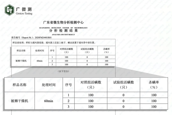 来看看ta的除螨检测报告,除螨率高达100%!每天烘上1小时,为自己营造一个安心健康的环境~