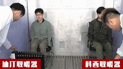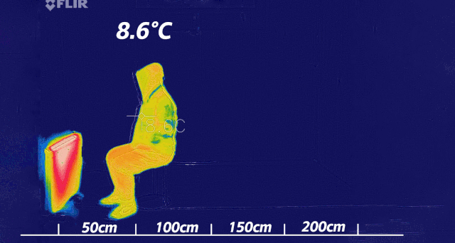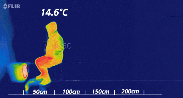 直接看结果:在热感仪成像中,小太阳的热量只能暖到膝盖;而科西除了膝盖,还能把你全身都暖热!