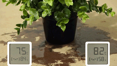 可以看到绿植叶片上的水珠就像初春的小雨一样不断滑落,底部的木板逐渐被润湿。