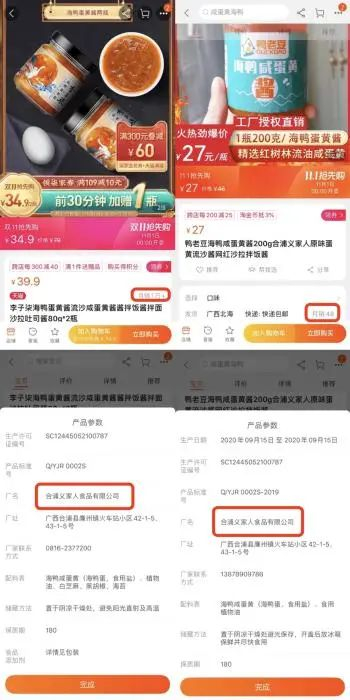 例如,李子柒旗舰店售卖的“海鸭蛋黄酱”,80g×2瓶共160g,“双11”售价34.9元,其委托生产商为“合浦义家人食品有限公司”。中新网在购物平台上搜索该公司,发现其生产的另一品牌“鸭老豆”的海鸭咸蛋黄酱,200g/瓶,售价27元,价格远低于李子柒店铺所售,但其48笔的月销量和李子柒店铺1万+的月销量相比,远远不在一个数量级上。