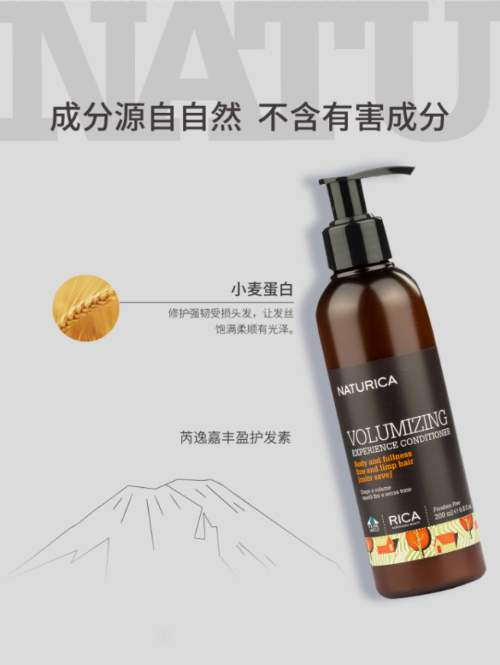 给头发补充小麦蛋白,护发素也是必备美发产品之一。RICA丰盈护发素以小麦蛋白为主要成分,洗完头发后涂抹于发梢,5mins内,给头发集中、深入、密集护理,为发丝补充润泽营养,赋予秀发生命力与分量感,修复吹、染、烫等对发质的伤害,进一步强韧发丝。秀发强韧,各种造型自然可以随心换!