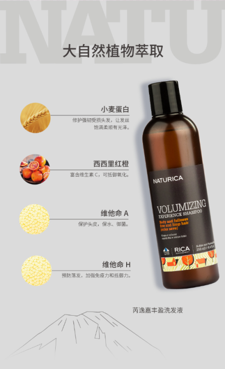 RICA丰盈洗发水,富含小麦蛋白,可以深入到毛囊中,修护并强韧受损头发,还能在发丝外部形成一层保护膜,增强发丝抵御力。洗发液中的西西里红橙和维他命A、H,还可以帮助抵御氧化,多重植物精萃,可以充盈并重建发丝结构,秀发状态恢复健康,自然丰盈、蓬松、强韧,提升整体颜值。