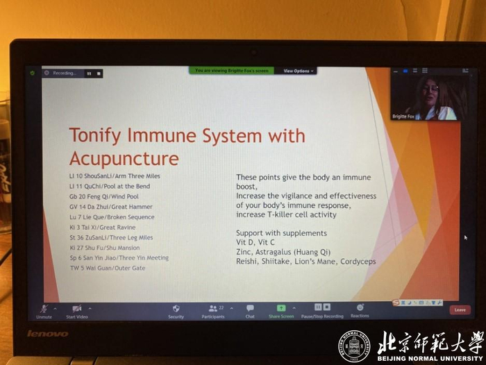 10月8日,为了满足威廉玛丽大学和威廉斯堡社区的人们对传统中医更进一步了解的意愿,威玛孔院携手威廉斯堡中医专家布里吉特·福克斯(Brigitte Fox )作为主讲嘉宾举办两期线上讲座。福克斯作了以“针灸在病毒性疾病的治疗和预防中的古代用法和现代应用”为主题的第一期讲座。她从中医角度出发,介绍了针灸的理论体系和操作方法,包括阴阳、经络、穴位等概念以及任脉、督脉、十二经络图、穴位图等内容,其中重点讲解了针灸在预防基础疾病、提高人体自愈能力和改善免疫系统功能方面的原理和价值。福克斯表示针灸在治疗病毒性疾病症状、增强免疫系统、加强人体自愈能力等方面有巨大作用。