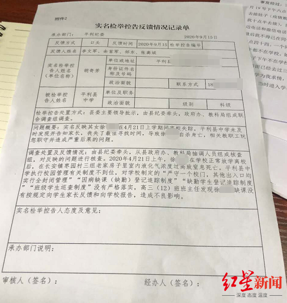 根据平利县纪委9月15日向胡女士出具的一份实名检举控告反馈情况记录表,调查处置及反馈意见为,由县纪委牵头,从县政府办、教科局抽调人员组成核查组,对反映的问题进行核查。2020年4月21日上午,徐某某在学校正常放学离校后,在长安镇枣园村三组老家房子里室内液化气浓度过高窒息死亡。平利县中学执行校园管理有关制度不到位,对学校制定的“严守一个校门,其他出入口均实行全封闭管理”“因病缺课(缺勤)登记追踪制度”“缺勤学生登记追踪制度”“班级学生巡查制度”没有严格落实,高三(12)班班主任发现徐某某缺课没有按规定向学生家长反馈和向学校报告,造成不良影响。