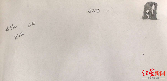 据同学发现,徐某某离开学校之前,在课桌上留了一张纸条上面写了4个“对不起”,旁边画了一个人拉着一个小孩。在女儿的手机备忘录里,写了9个“对不起”,显示时间为4月21日12点24分。