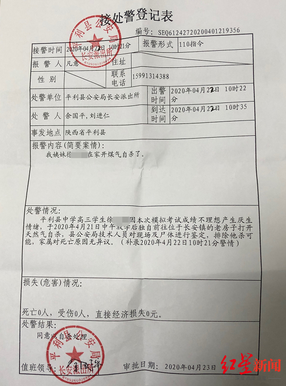 红星新闻从平利县公安局接处警登记表看到,处警情况称,平利县中学高三学生徐某某因模拟考成绩不理想产生厌生情绪,于2020年4月21日中午放学后独自前往长安镇的老房子打开天然气自杀,县公安局技术人员对现场尸体进行鉴定,排除他杀可能,家属对死亡原因无异议。