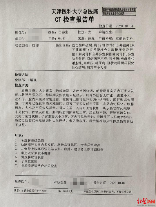张颖为红星新闻出示了白春生于接受的CT及磁共振检查单。多张报告单的“印象”栏显示如下内容:考虑脾脏破裂伤;左脑顶颞部及颌面部软组织肿胀并头皮血肿;左侧第7、9肋、右侧第11肋骨折;胸12椎体骨折;胸12、腰2右侧横突及腰1两侧横突、左侧下关节突骨折,胸11、12、腰1棘突骨折。
