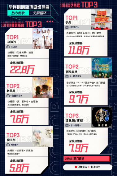榜单精心盘点了当月热播剧集、爆火综艺中的热歌神曲,如由鞠婧祎演唱的热播剧《如意芳霏》的插曲《古画》以22.8万的全民点唱量独占鳌头,成为十月热播剧OST全民点唱量第一名;年轻人喜爱的《说唱新世代》中,仙女于贞的《粒子们》同样以11.8万的全民点唱量登上十月综艺热歌首位。还有更多新热的影视综艺原声带可以直接进入站内搜索分类查找,跟着全民K歌月榜唱,争当朋友圈的潮酷歌王。