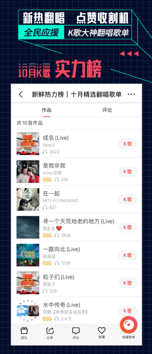 粉丝们不仅能在全民K歌平台内为明星歌手应援呐喊,同样可以为自己喜爱的达人主播、实力唱将打call。10月火热上榜翻唱作品,不少都获得了SSS评级,萌力十足的《我喜欢你》、抒情悠扬的《是我非我》、深情磁性的《寻一个天荒地老的地方》在站内疯狂圈粉,收获歌友的大量鲜花应援。新鲜热力榜让优质翻唱内容被更多人发现和听见。