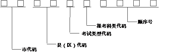其中市、县(区)代码为报名点所在市、县(区)的代码,考试类型代码为8,报考科类代码为1。