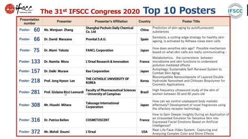 TOP10上榜第一排,中国唯一化妆品企业获奖:百雀羚科学家张文娟荣获2020年第31届日本横滨IFSCC全球化妆品科技联盟大会TOP 10十佳海报奖:获奖论文题目“通过独创数学模型和皮肤中的自发荧光物质预测肌龄”。