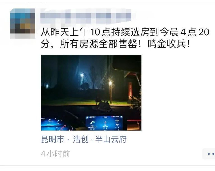 今天凌晨,浩创·半山云府的一名相关销售负责人发朋友圈表示,该项目从4日上午10点持续选房到今天凌晨4点20分,所有房源已全部售罄。
