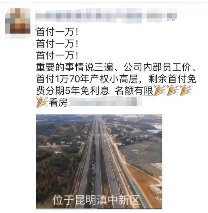 另外一名中介的朋友圈也发了相似的内容,只说明“首付一万,剩余首付免费分期5年免利息”等内容,指出在滇中新区,并没有说明项目,显得比较神秘。