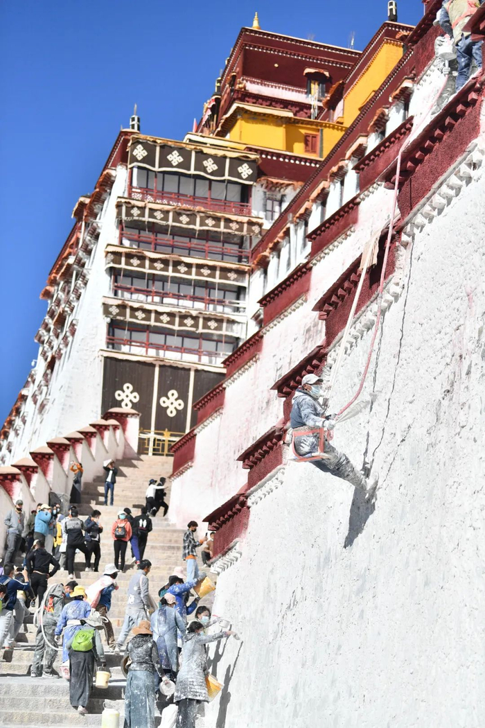 他们背着涂料桶,说说笑笑,拾阶而上,各色的衣服点缀于白墙,形成了布达拉宫每年最亮丽、最具活力的一道风景线。