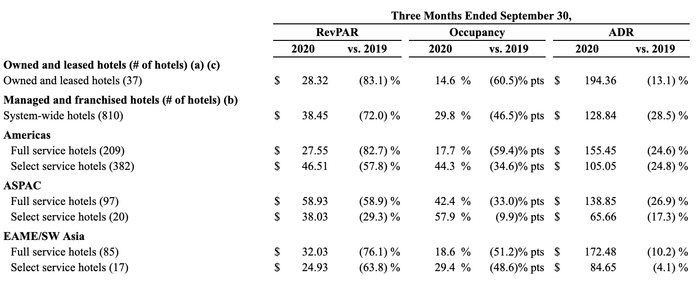 数据显示,今年第三季度,凯悦自有和租赁的酒店入住率仅14.6%,管理和特许经营的酒店入住率29.8%。从地区来看,全系统内美洲地区全服务酒店的入住率17.7%、精选酒店入住率44.3%;亚太地区全服务酒店入住率42.4%、精选酒店入住率57.9%;非洲及中东地区/亚洲西南部全服务酒店入住率18.6%、精选酒店入住率29.4%。