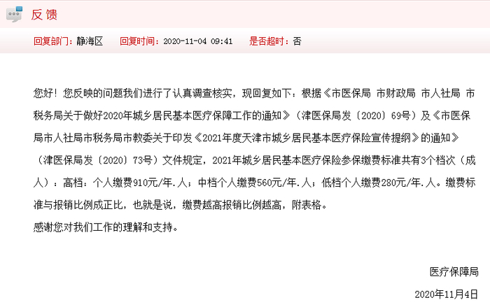 静海区区委回复:根据《市医保局 市财政局 市人社局 市税务局关于做好2020年城乡居民基本医疗保障工作的通知》(津医保局发〔2020〕69号)及《市医保局市人社局市税务局市教委关于印发《2021年度天津市城乡居民基本医疗保险宣传提纲》的通知》(津医保局发〔2020〕73号)文件规定,2021年城乡居民基本医疗保险参保缴费标准共有3个档次(成人):高档:个人缴费910元/年.人;中档个人缴费560元/年.人;低档个人缴费280元/年.人。缴费标准与报销比例成正比,也就是说,缴费越高报销比例越高。