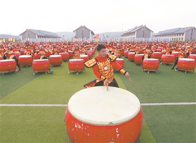 沈阳市法库县东湖三中大辽战鼓社团在校园艺术节上进行展示。(资料图片)