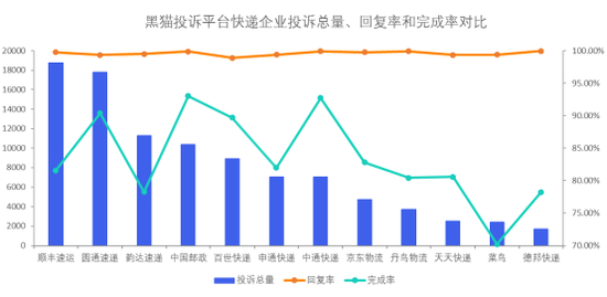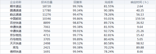 快递企业投诉数据对比:中国邮政、中通快递、圆通速递投诉完成率较高