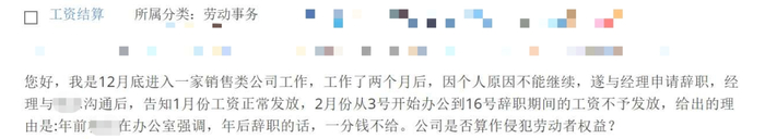 2019年12月底,我进入一家销售类公司工作,工作了两个月后,因个人原因不能继续,遂跟经理申请辞职,经理与领导沟通后,告知2020年1月份工资正常发放,同年2月份从3号开始办公到16号辞职期间的工资不予发放,给出的理由是:年前领导在办公室强调,年后辞职的话,一分钱不给。公司这样的行为是否算侵犯劳动者权益?