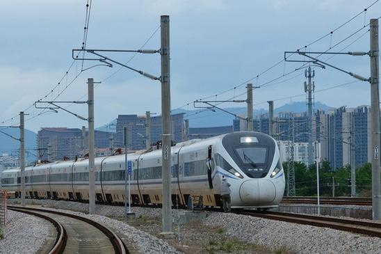 11月6日,一列环岛高铁列车行驶在铁道线上。(摄影:杨宝森)