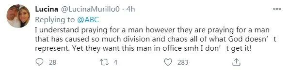 为某个人祈祷是可以理解的行为,但不能理解的是,正是他们为之祈祷的人导致了上帝所不赞同的巨大分裂和混乱。即使这样,他们也希望这个人能保住总统位子,这一切我看不懂!