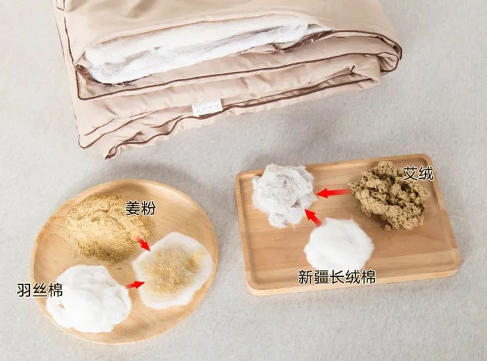 若只有姜粉和艾绒,会压身、不暖和。但这被子蓬松松的,盖着又暖又香,好舒服。