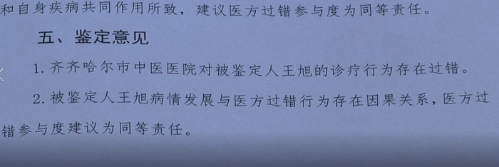 事情发生后,齐齐哈尔市中医医院南院区和患者家属一起做了司法鉴定,司法鉴定意见显示:一、齐齐哈尔市中医医院对被鉴定人王旭的诊疗行为存在过错;二、被鉴定人王旭病情发展与医方过错行为存在因果关系,医方过错参与度建议为同等责任。