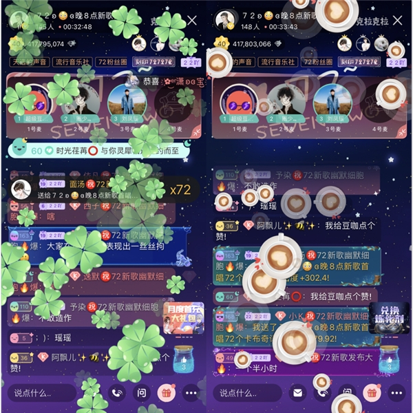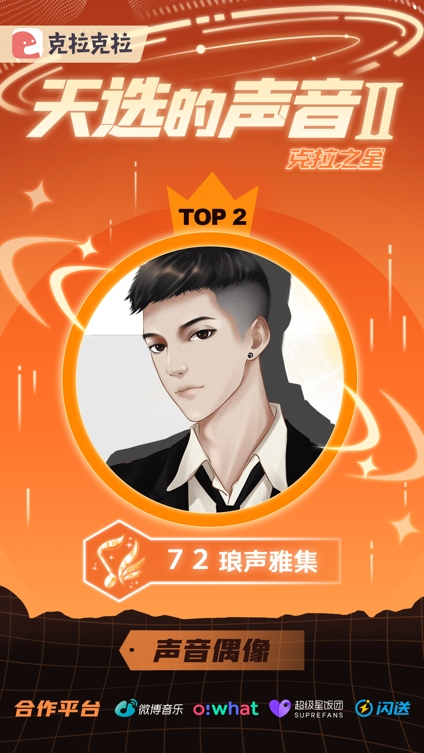 72是克拉克拉的人气唱见,是刚刚结束的克拉克拉《天选的声音》第二季出道的声音偶像。入驻克拉克拉一年多的时间里,72通过自己磁性的嗓音和欢脱的直播风格收获了大量粉丝的喜爱。在《天选的声音II》激烈的赛制中,72的表现仍然让人眼前一亮,成为夺冠的热门人选。