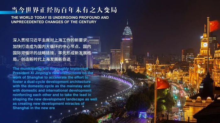 当今世界正经历百年未有之大变局,上海处在“十三五”收官、“十四五”开局重要关口。上海要深入贯彻习近平主席对上海工作的新要求,以强化“四大功能”为主攻方向,深入推进“三大任务、一大平台”和“五个中心”建设,大力发展创新型、服务型、开放型、总部型、流量型“五型”经济,加快打造成为国内大循环的中心节点、国内国际双循环的战略链接,率先形成新发展格局,创造新时代上海发展新奇迹。