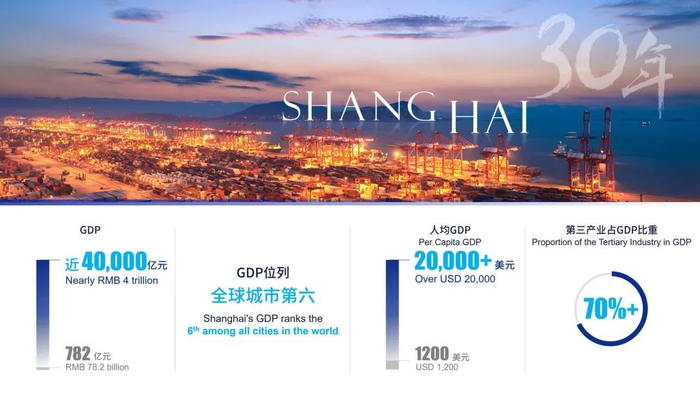 上海始终坚持发展是第一要务,GDP从782亿元增长到近4万亿元,在全球城市中位列第6,人均GDP从1200美元提高到超过2万美元,第三产业占比从不到30%提升至70%以上,经济社会发展取得历史性成就、发生历史性变革。