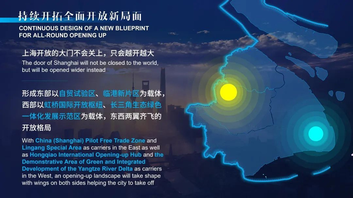 开放是城市活力之源。上海开放的大门不会关上,只会越开越大。上海将继续高举浦东开发开放旗帜,发挥对内对外两个扇面作用,以开放促改革、促发展、促创新,形成更高水平开放型经济新体制。对标高标准国际经贸规则,推动贸易投资自由化便利化,发展数字贸易等新业态新模式,放大进博会溢出带动效应,打造服务“一带一路”建设的桥头堡,形成东部以自贸试验区、临港新片区为载体,西部以虹桥国际开放枢纽、长三角生态绿色一体化发展示范区为载体,东西两翼齐飞的开放格局。