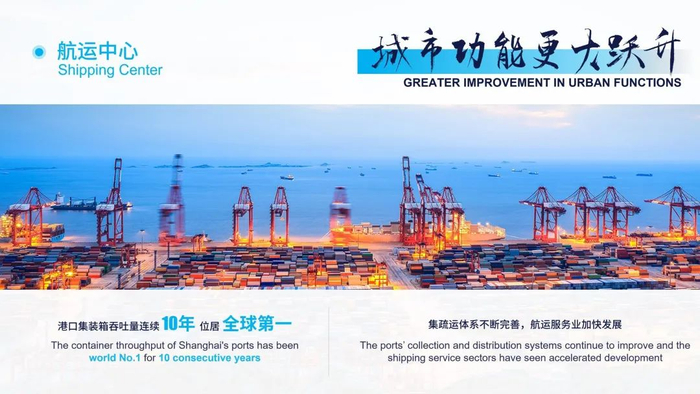 上海港口集装箱吞吐量连续10年位居全球第一,集疏运体系不断完善,航运服务业加快发展。