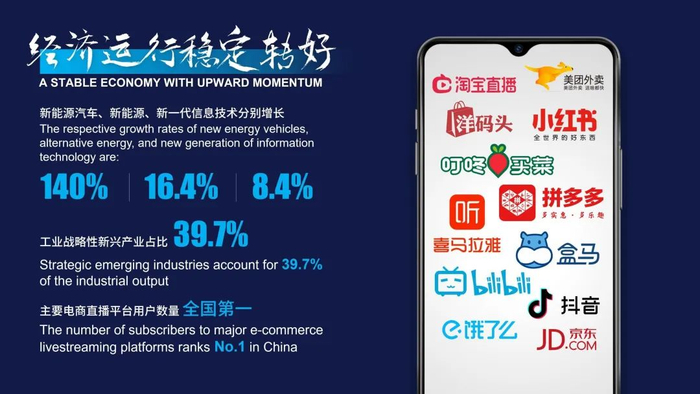 新动能快速成长,新能源汽车产值大幅增长140%,新能源增长16.4%,新一代信息技术增长8.4%,工业战略性新兴产业占全市工业总产值比重提高到39.7%。主要电商直播平台用户数量全国第一,生鲜冷链、远程医疗、在线视听、无接触配送等在线新经济蓬勃发展。