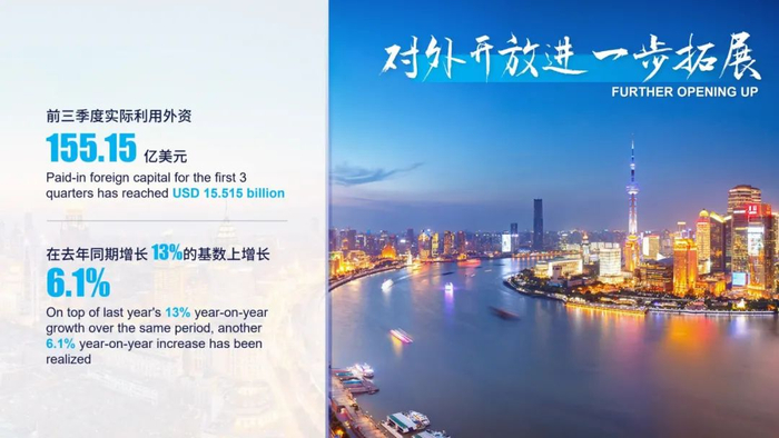 前三季度实际利用外资155.15亿美元,在去年同期增长13%的高基数上继续增长6.1%。去年城市推介大会达成合作意向的149个项目,144个已落地。目前累计实际利用外资超过2700亿美元,近6万家外资企业在这里蓬勃发展。