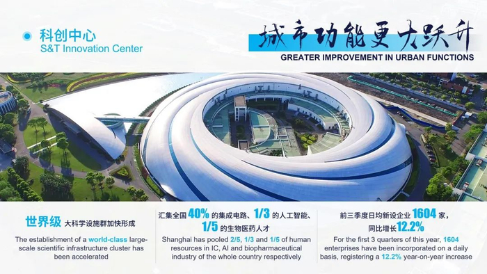 张江国家实验室挂牌,世界级大科学设施群加快形成,全国40%的集成电路、1/3的人工智能、1/5的生物医药人才汇集上海,全球科技创新策源功能持续增强。