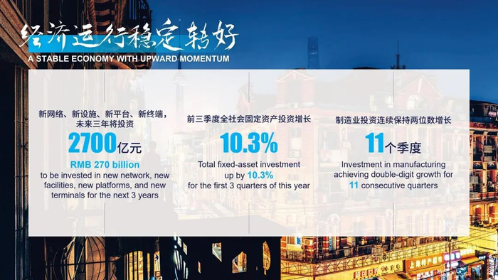 聚焦5G、数据中心等新网络、新设施、新平台、新终端,未来三年将投资2700亿元。新基建带动投资同步回升,前三季度全社会固定资产投资增长10.3%,制造业投资连续11个季度保持两位数增长。