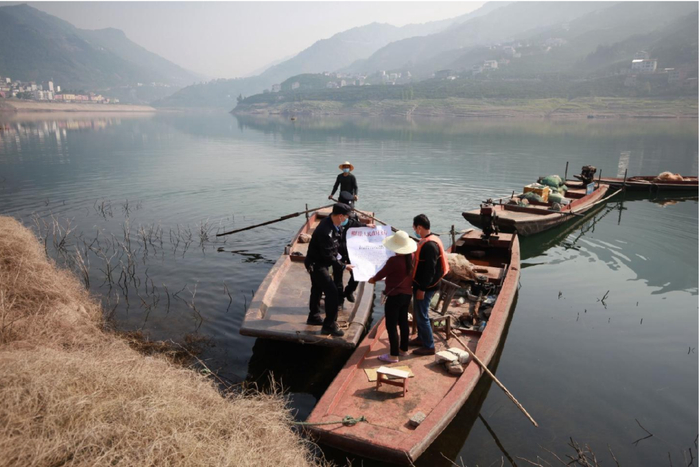 湖北秭归,民警向渔民宣讲长江禁捕令。吴令剑摄(中经视觉)