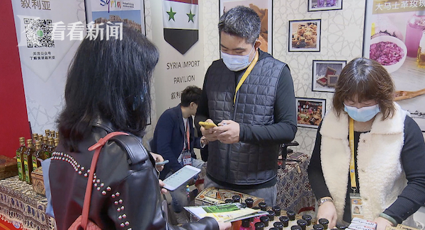 源源不断的客源、订单,让展区的中方负责人们忙得不亦乐乎。一边要与采购商、客户互加微信、留下联系方式;另一边,也要随时与叙利亚的供应商们保持联系,保证对方的供应量。很快,叙利亚进口馆的产品也将进入一家知名连锁超市。董晶岩通过视频告诉叙利亚的供货商:“今天早上有些客户来了,他们预定了10大箱的样品,另外还有一家超市可能明天来签约。”