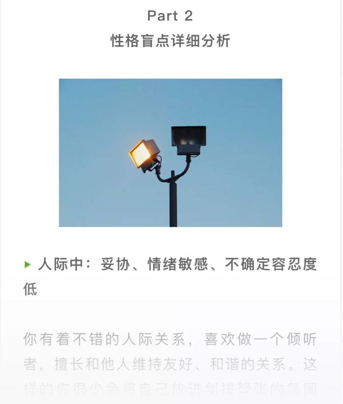「性格盲点测试」将从四个维度出发评估你性格的“盲点”是什么,并从人际、工作和情感三方面分析性格盲点对你的影响,为你提供专业提升建议,帮助你更好地改善。